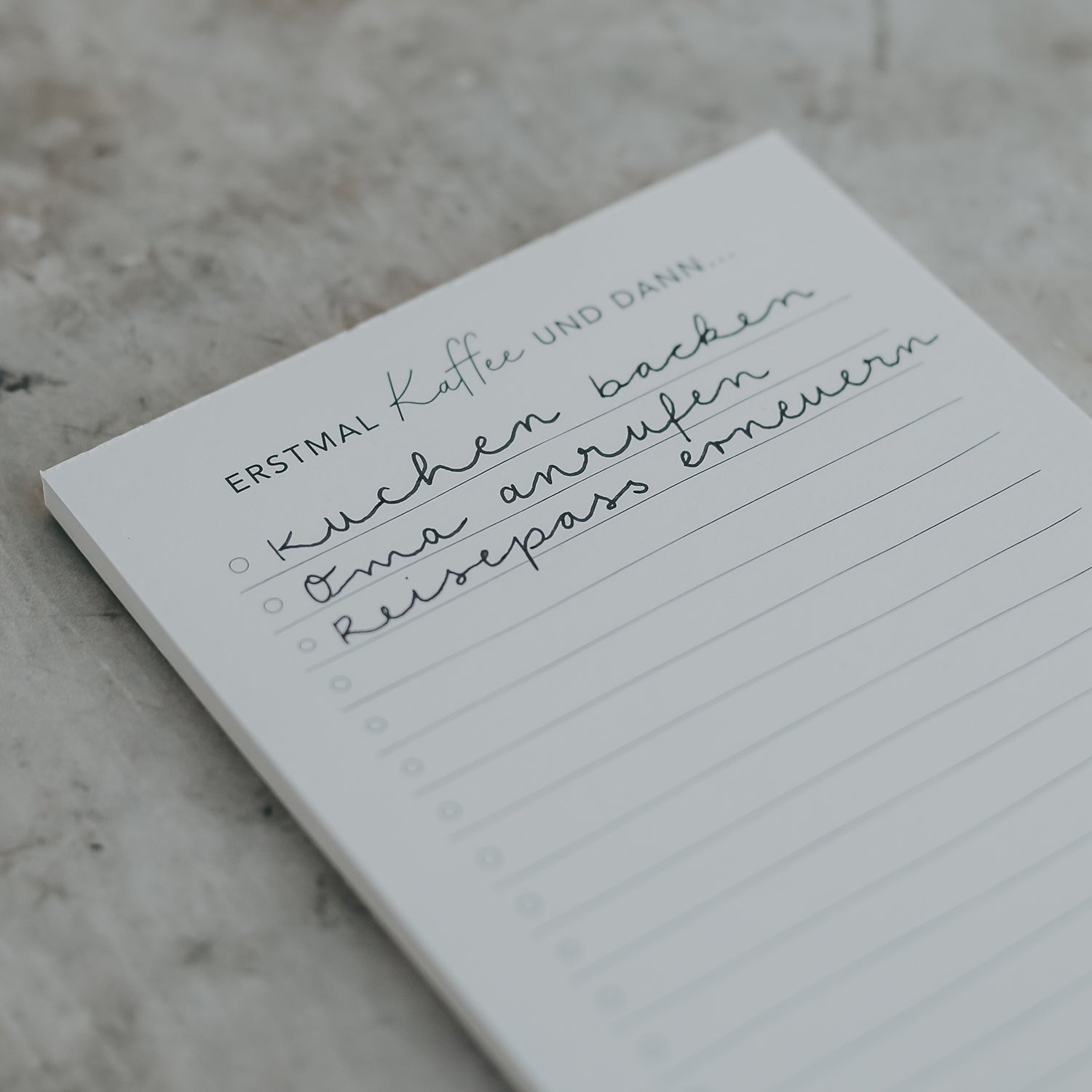 Die 50 Blatt werden mit einer Leimbindung zusammengehalten, die ein einfaches und sauberes Abtrennen der Blätter ermöglicht. Das praktische DIN A6 Format von 14,8 x 10,5 cm schafft genau den richtigen Platz um alles unterzubringen. Die Rückseite des Notizblocks ist mit einer stabilen Pappe verstärkt.