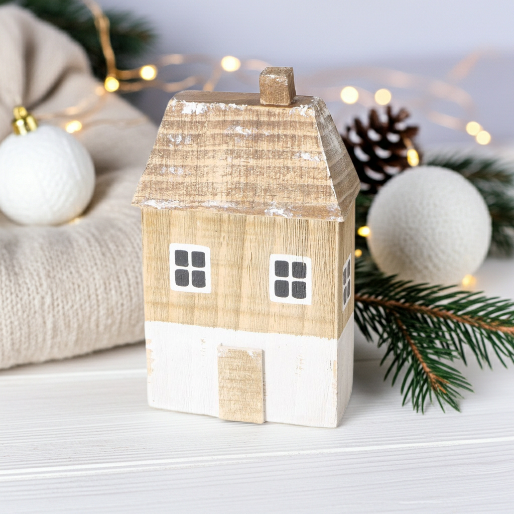 Bringe mit diesen handgefertigten Deko-Häuschen aus naturbelassenem und handbemalten Holz den nordischen Flair in deine Winterdekoration.