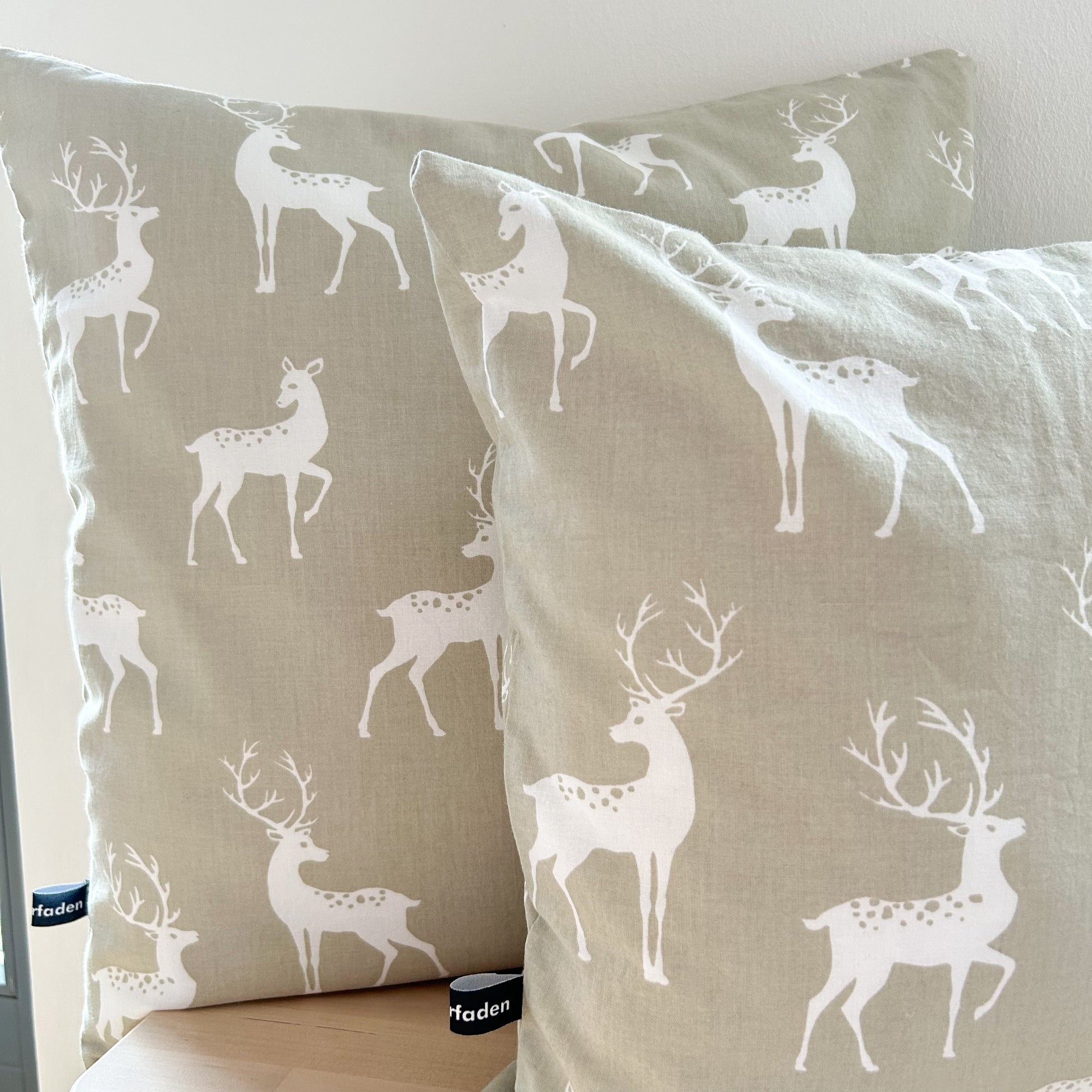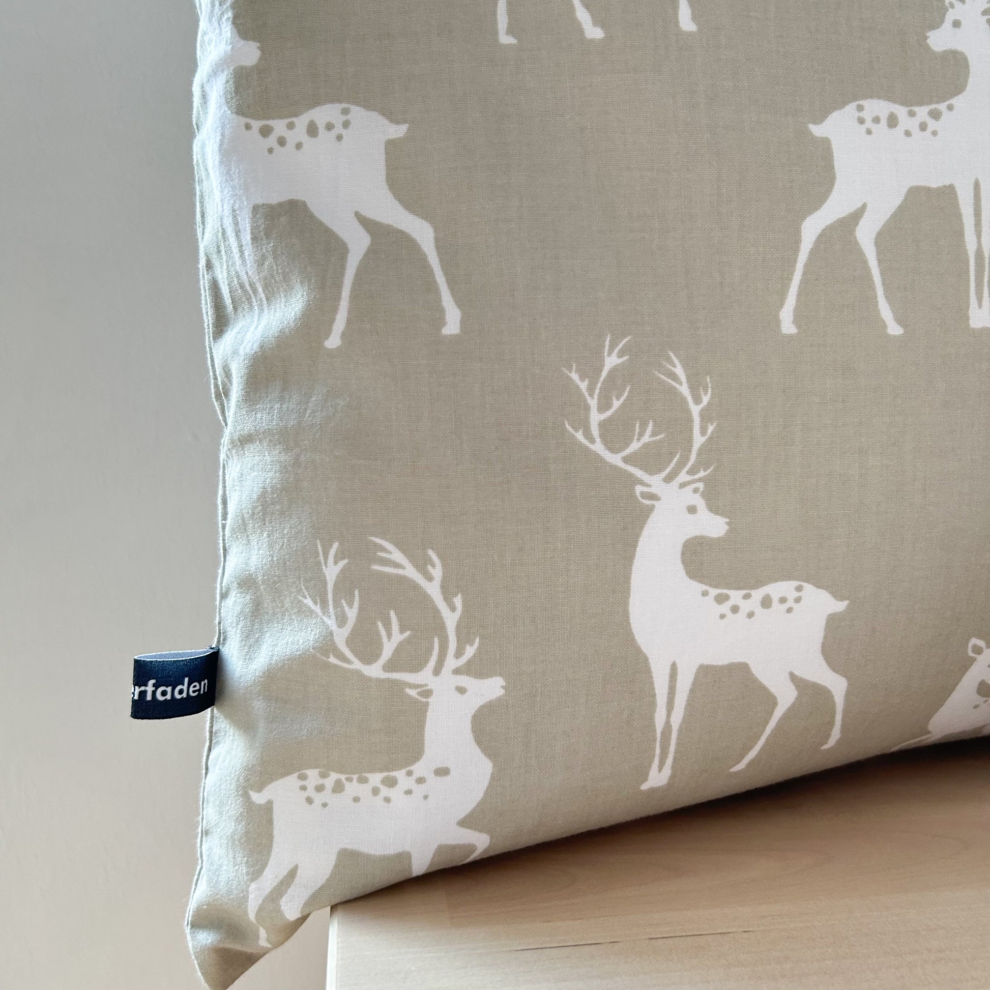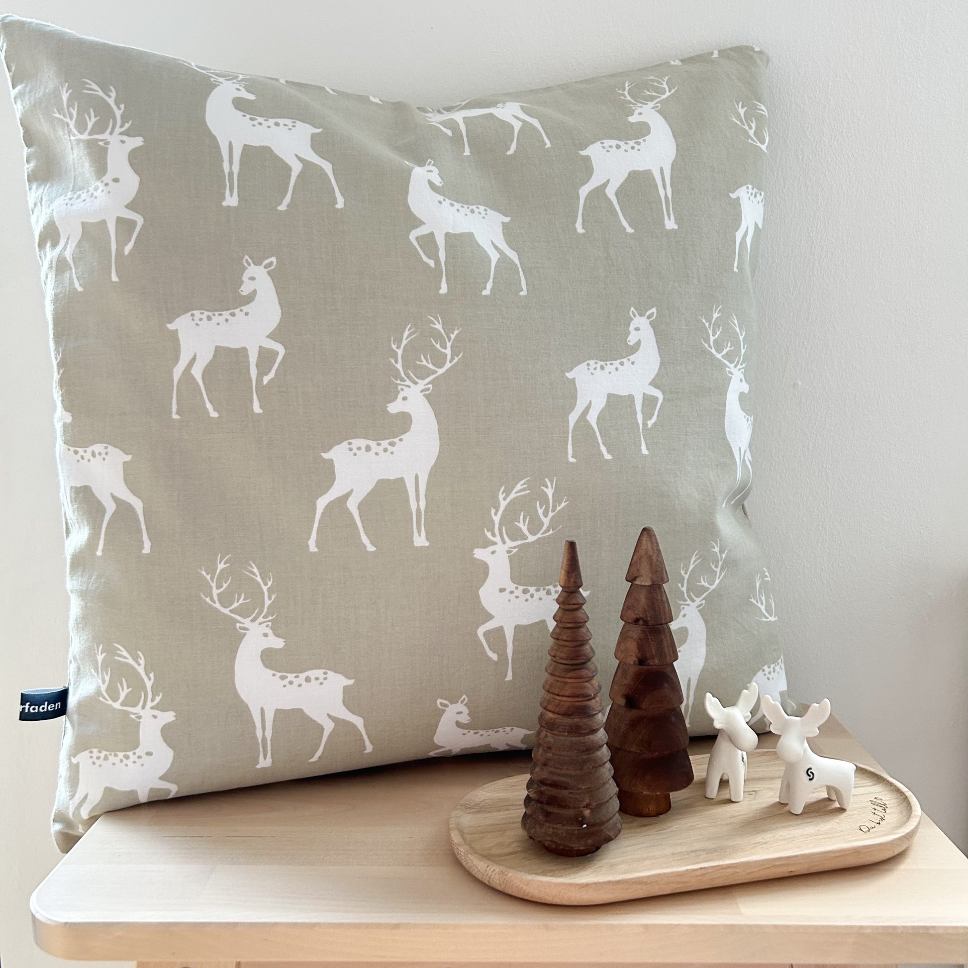 Sehr schöne Kissenhülle in beigen Tönen im Skandi Look, mit Hirschen und Rehen.