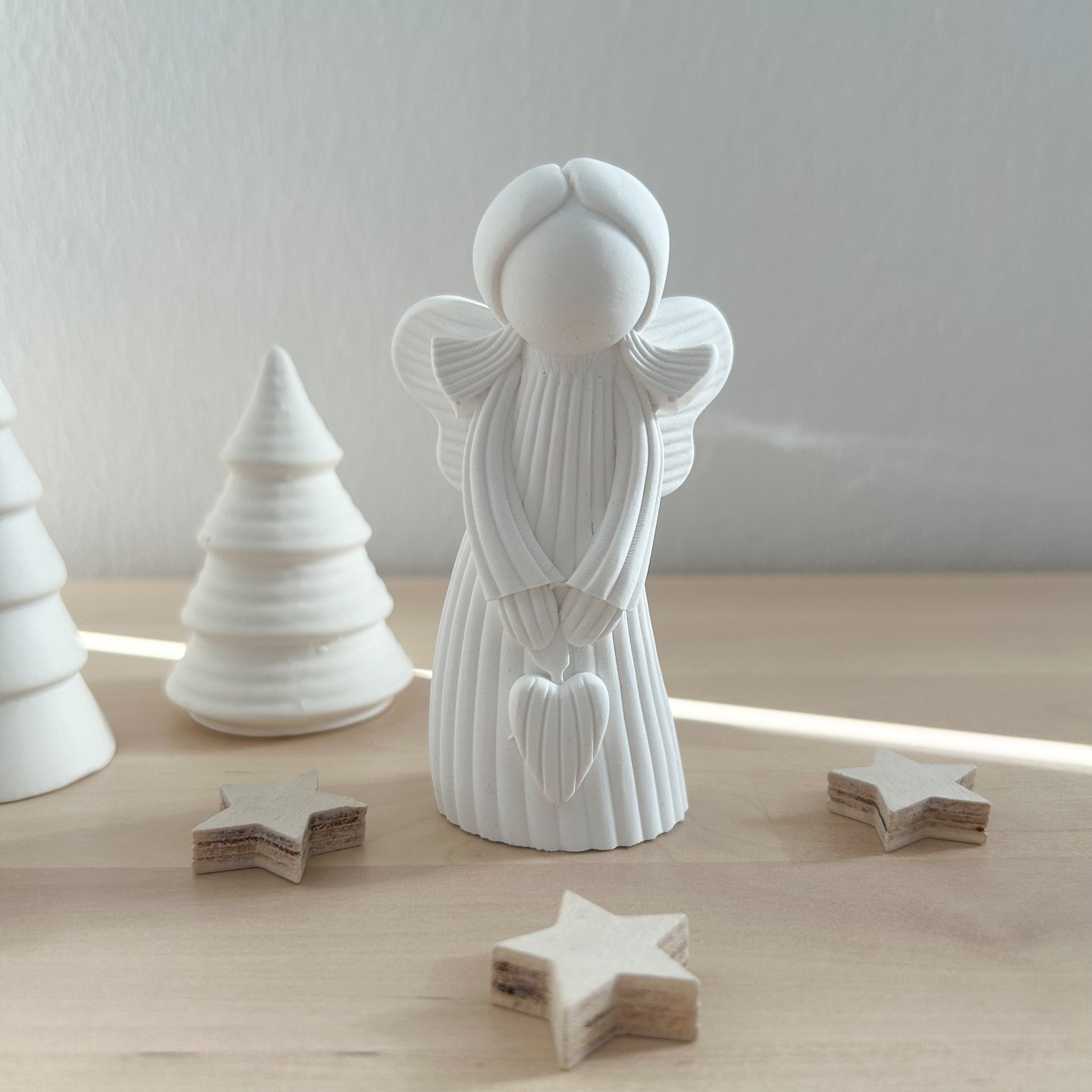 Dieser liebevoll von Hand gegossene Engel aus feiner Gießkeramik vereint Schlichtheit und Ausdruckskraft. In reinem Weiß gehalten, trägt er ein kleines Herz in den Händen – ein Symbol für Liebe, Schutz und Frieden. Die feinen Rillen verleihen der Figur eine besondere Struktur und unterstreichen ihren modernen, minimalistischen Charakter. Sehr schön auch in Kombination mit der kleineren Variante)